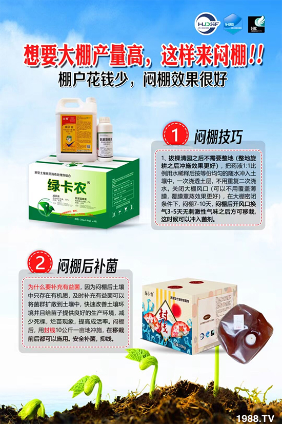 山東卡農(nóng)化學(xué)有限公司對(duì)當(dāng)前根結(jié)線蟲、重茬死棵等土傳病害難防治的特點(diǎn),推出的化學(xué)燜棚專用產(chǎn)品-綠卡農(nóng)-35%威百畝+5%氨基寡糖素,在調(diào)理土壤、殺死根結(jié)蟲方面有突出成效!