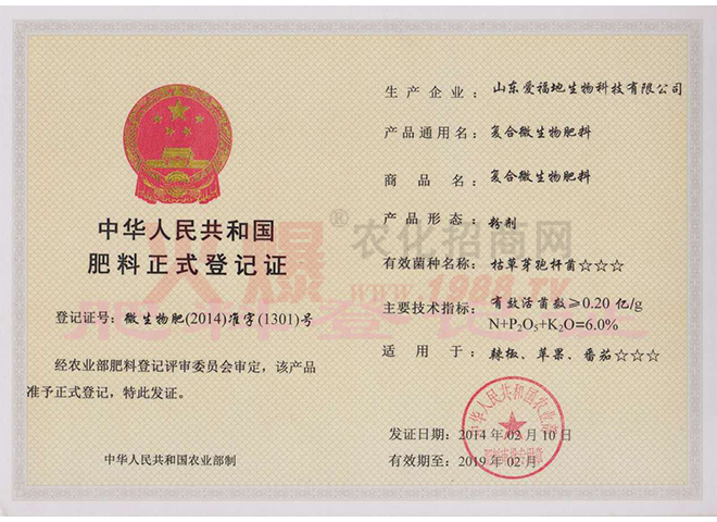 證書名稱:肥料正式登記證 發(fā)證機構(gòu):中華人民共和國農(nóng)業(yè)部