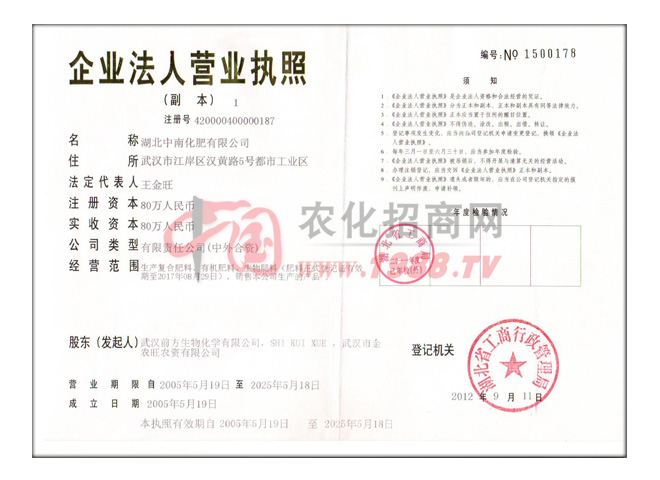 湖北中南化肥有限公司成立于2005年12月。中南化肥有限公司由美國S.K.X等中美兩國高科技企業(yè)合資興建,由武漢市批準(zhǔn)、湖北省工商行政管理局注冊登記的外資企業(yè)。中南化肥公司吸收了包括美國農(nóng)業(yè)博士、國內(nèi)農(nóng)業(yè)大學(xué)和科研單位的農(nóng)業(yè)教授、研究員和高級農(nóng)藝師在內(nèi)的一大批國際化肥方面的高級技術(shù)人才。中南(國際)化肥有限公司為中國化工學(xué)會化肥專業(yè)委員會團(tuán)體會員,華中農(nóng)業(yè)大學(xué)教學(xué)實(shí)習(xí)和科研成果轉(zhuǎn)化基地。
