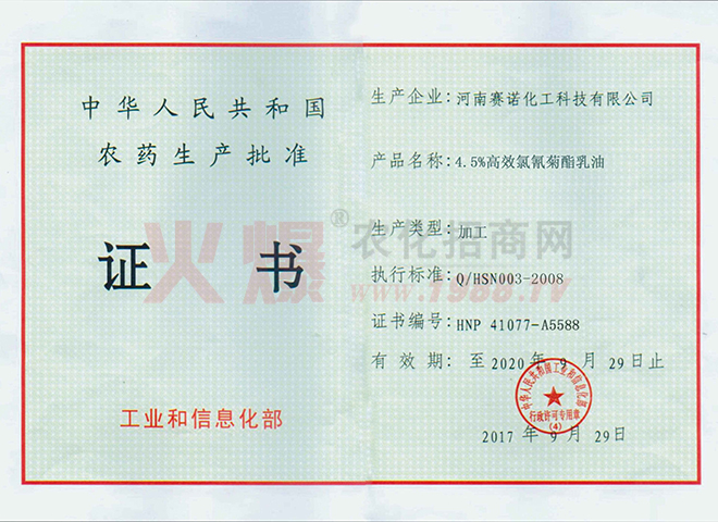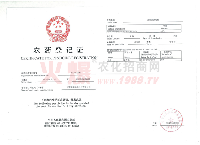賽諾公司于2011年3月在國家農(nóng)業(yè)部進(jìn)行了豐之盼產(chǎn)品的登記申報(bào),并于2014年4月25日獲得了國家的正式農(nóng)藥登記,登記號(hào)為PD20141062。這是國內(nèi)第二家取得制劑正式登記的廠家。也是第二家把誘抗素商品化生產(chǎn)的廠家。